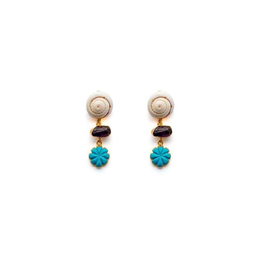 Charm-øreringe lavet med en spiralskal, rå ametyst og en raffineret turkisblomst. Denne vare er håndlavet på bestilling. Produktionen kan tage op til to uger.