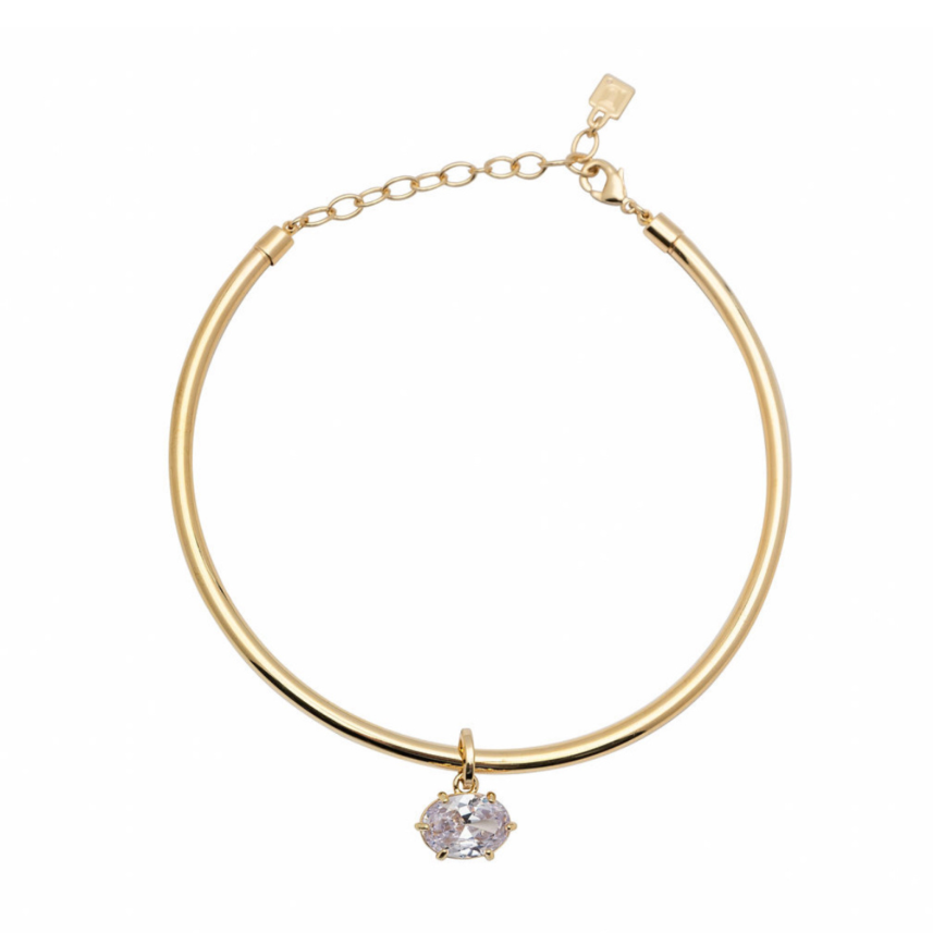 Collare in metallo dorato con pendente in cristallo trasparente. Rappresenta il perfetto equilibrio tra audacia e femminilità.
